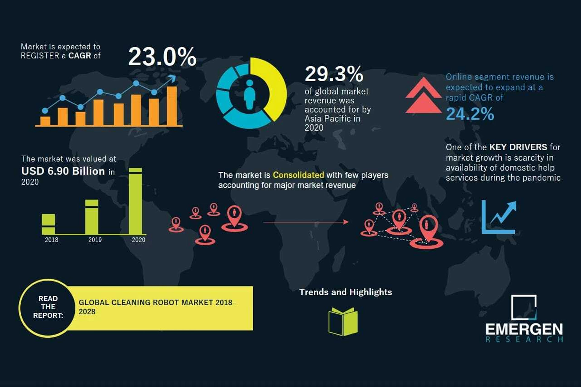 The cleaning and disinfection robot market size is rising rapidly. Emergent Research estimated in 2020 that the global market size for cleaning robots was US$ 6.9B. They project a growth rate of 23% per year from 2020 to 2028. Thus, the market size will reach US$ 36.05B by 2028. That is a fivefold increase in 8 years.